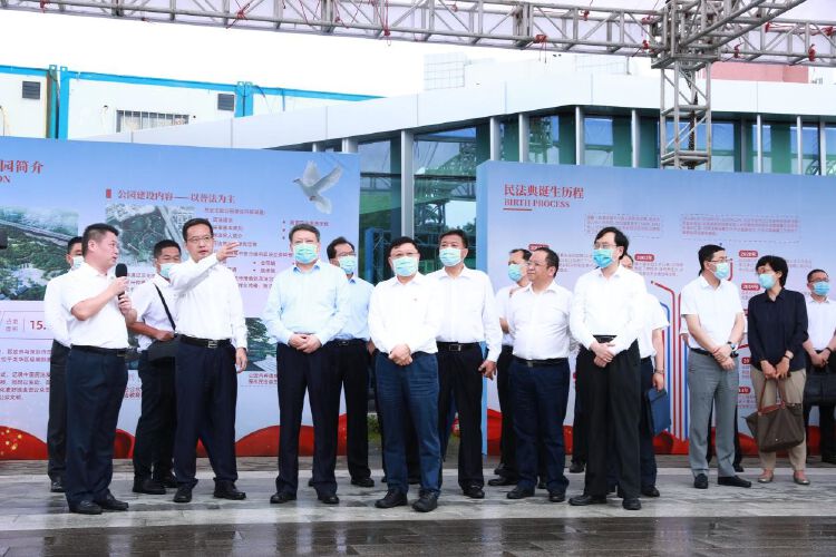 ◊2020年8月1日,中央依法治国办副主任、司法部部长唐一军参观深圳民法公园,深圳市委书记王伟中陪同。
