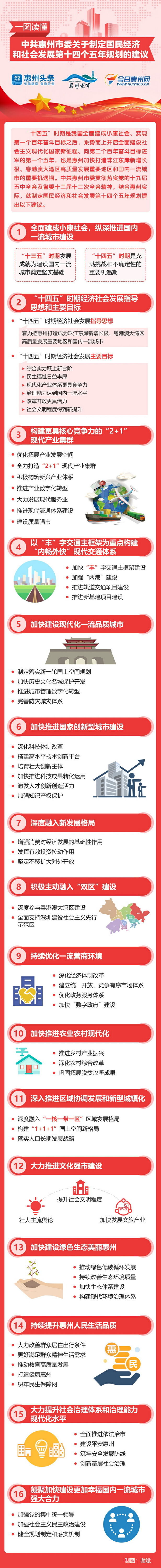 日前召开的惠州市委十一届十次全会审议了《中共惠州市委关于制定国民经济和社会发展第十四个五年规划的建议》。1月4日,惠州市委办印发了该建议稿。建议稿分16个部分59条,约1.4万字,详细描绘了惠州未来五年的发展蓝图。 “十四五”时期是我国全面建成小康社会、实现第一个百年奋斗目标之后,乘势而上开启全面建设社会主义现代化国家新征程、向第二个百年奋斗目标进军的第一个五年,也是惠州加快打造珠江东岸新增长极、粤港澳大湾区高质量发展重要地区和国内一流城市的重要机遇期。 今后五年惠州将怎么干?惠州报业传媒集团旗下惠州头条APP带你一图速览建议稿内容精要。