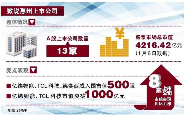 个股方面,截至2020年12月31日收盘,13家惠州A股上市公司中,有1家公司市值突破1000亿元,即亿纬锂能,市值1539.43亿元。除此之外,还有7家公司市值超过100亿元,分别是TCL科技、德赛西威、胜宏科技、德赛电池、中潜股份、华阳集团、光弘科技,其中TCL科技市值达993.4亿元。