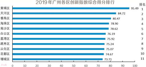 首先从广州各区创新指数综合得分看,广州各区在“你追我赶”中的排名呈现一些新变化。