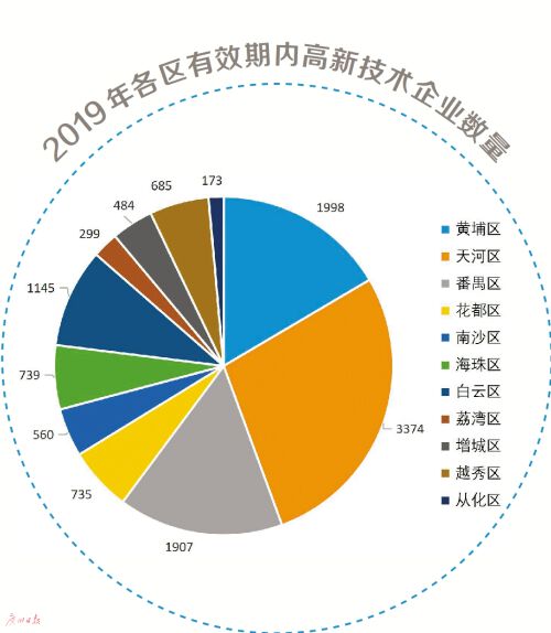 但是从高新技术企业数量绝对数量来看,各区的差距还是较为明显。2019年广州有效期内的高新技术企业有12099家;其中天河区有3374家,黄埔区有1998家,番禺区有1907家,白云区有1145家,四个区的高新技术企业数之和(8424家)占广州高新技术企业总数的比重接近七成。