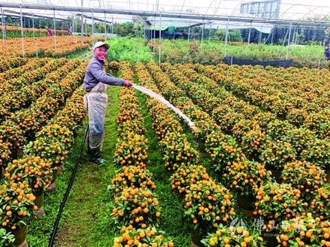 昨日,顺德区陈村镇仙涌村年桔种植户李志明正在为桔田浇水。/佛山日报记者郭东霓摄