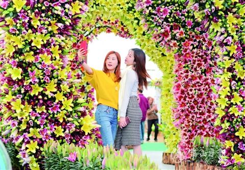 南海推出买花+乡村游线路,鼓励市民到种植基地参观采购。图为2020年第九届百合花文化节上,市民在百合花景前拍照打卡。