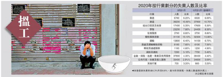 政府统计处昨日发表统计数字,显示失业率由2020年9至11月的6.3%,到10至12月上升至6.6%;就业不足率则保持3.4%水平。以行业计,零售、住宿及膳食服务业有相对明显的上升(见表)。就业不足率方面,零售业同样上升,只是货仓及运输辅助活动下降而弥补;失业人数由244300人上升至245800人,增加约1500人。
