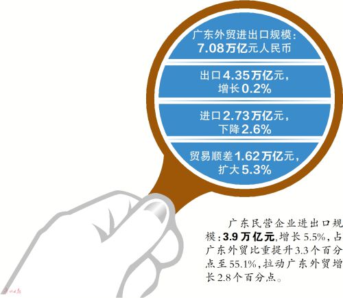 其中,民营企业带动作用突出,内生动力增强。2020年,广东民营企业进出口3.9万亿元,增长5.5%,占广东外贸比重提升3.3个百分点至55.1%,拉动广东外贸增长2.8个百分点;外商投资企业进出口2.79万亿元,下降7%;国有企业3748.2亿元,下降10.7%。