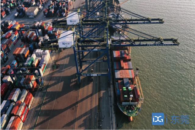 东莞港集装箱码头,巨轮满载出口货品准备出发
