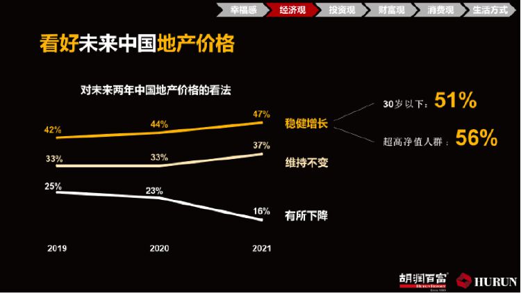 看好国内地产价格:47%的高净值人群认为未来两年国内地产价格将“稳健增长”,较去年增加3个百分点,37%认为将“维持不变”,16%认为将有所下降,较去年减少7个百分点。其中,超高净值人群对地产价格的信心更足,认为“稳健增长”的比例达56%。