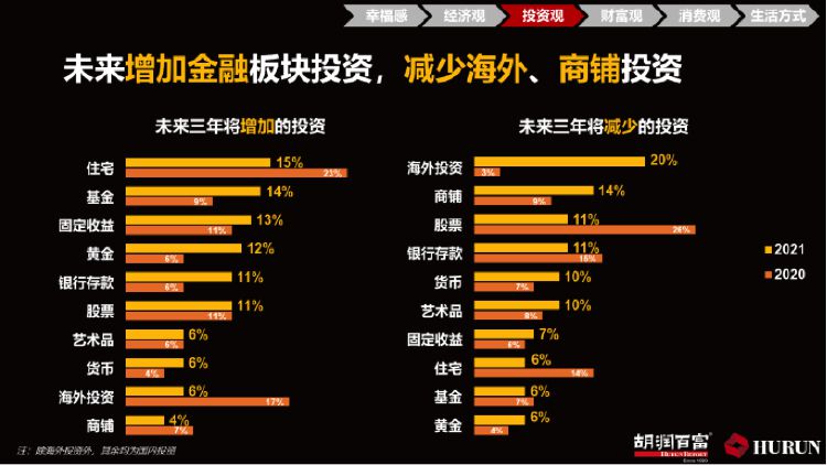 投资方向:住宅仍是高净值人群未来主要投资方向,但比例下降8个百分点。而基金的选择比例上涨5个百分点,超过股票,位居第二。此外,固定收益、银行存款、黄金及货币等金融资产的选择比例均有所上升。未来进行海外投资的比例大幅下降,排在未来三年将减少的投资第一位。除海外投资外,商铺投资也不被高净值人群看好,排在未来三年将减少的投资第二位。胡润表示:“从全球投资趋势来看,由于国际宏观环境的不确定性,高净值人群将减少全球投资,回归中国。”