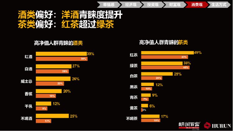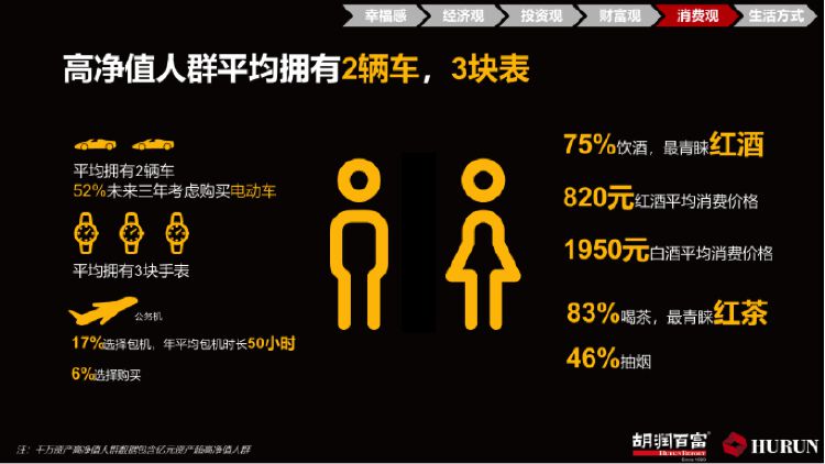 千万资产高净值人群平均拥有2辆车(52%未来三年考虑购买电动车),3块手表。23%受访者有公务机需求(17%选择包机,年平均包机时长50小时;6%选择购买)。75%饮酒,最青睐红酒,洋酒的青睐度提升。红酒的平均消费价格820元,白酒的平均消费价格1950元。83%喝茶,红茶超过绿茶,成为最青睐的茶类。46%有抽烟习惯。