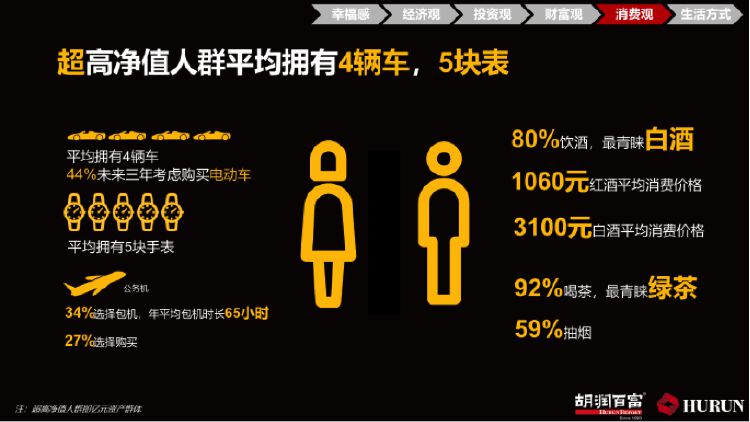 亿元资产超高净值人群平均拥有4辆车(44%未来三年考虑购买电动车),5块手表。61%受访者有公务机需求(34%选择包机,年平均包机时长65小时;27%选择购买)。80%饮酒,最青睐白酒。白酒的平均消费价格3100元,相当于市场上500毫升的53度飞天茅台价格,红酒的平均消费价格1060元。92%喝茶,最青睐绿茶。59%有抽烟习惯。
