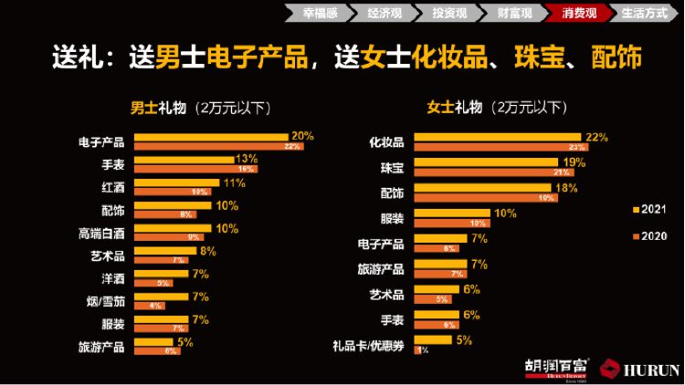 “中国高净值人群的送礼热情总体上升了41%。春节将近,又到了送礼物的高峰期。在2万元以下的礼物中,电子产品和酒类是中国高净值人群赠送男士礼物的首选,化妆品、珠宝和配饰是最受青睐的女士礼物。”