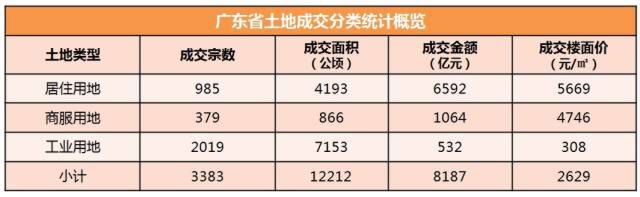 同时,2020年广东省居住用地成交金额比例首度突破八成,达到80.5%;工业用地成交金额比例下降至6.5%。