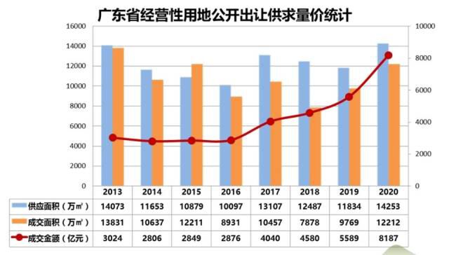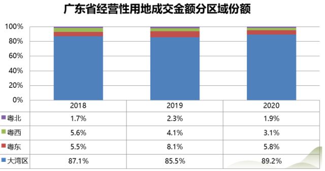 省房协专家据此指出,2020年是广东省土地市场大年,各项指标均创下新高。但是土地市场区域分化加大、各类用地供给比例不平衡、产业用地结构提升,大湾区9市经营性用地成交金额比重已上升至89.2%。