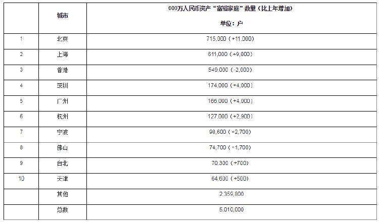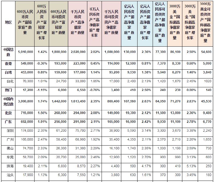报告称,截至2019年12月31日,中国内地富裕家庭和高净值家庭数量如下:拥有600万人民币资产的“富裕家庭”数量已经达到501万户;拥有千万人民币资产的“高净值家庭”数量达到202万户;拥有亿元人民币资产的“超高净值家庭”数量达到13万户;拥有3000万美金的“国际超高净值家庭”数量达到8.6万户。