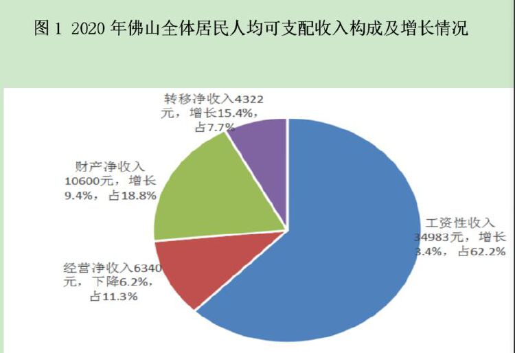 截至2020年11月,佛山市全市城镇新增就业80919人,失业人员再就业33097人,就业困难人员实现就业6812人。财产净收入增长稳定,快于可支配收入增速。佛山市全年居民人均财产净收入10600元,增长9.4%,占人均可支配收入比重为18.8%。佛山市三旧改造、城市更新等项目提升集体资产价值及居民房屋价值,随着疫情防控形势好转,外来人口逐渐回流复工,佛山居民房屋出租率有所提升,进而带动村居分红以及居民房屋租金水平;居民投资理财意识也不断增强,投资股份制企业和投资理财产品获得的分红增加,共同带动了居民财产净收入增长。另外,随着社会保障兜底不断完善,转移净收入增长居四大类收入之首。佛山市2020年全市财政民生支出678.99亿元,全年居民人均转移净收入4322元,增长15.4%,占人均可支配收入比重为7.7%。而经营净收入则受疫情影响较大,增速仍为负数。2020年初受疫情影响个体工商户大面积停工停产,加上农村禁养限养政策对农村经营户的后续持续影响,全年居民人均经营净收入6340元,下降6.2%,占人均可支配收入比重为11.3%。