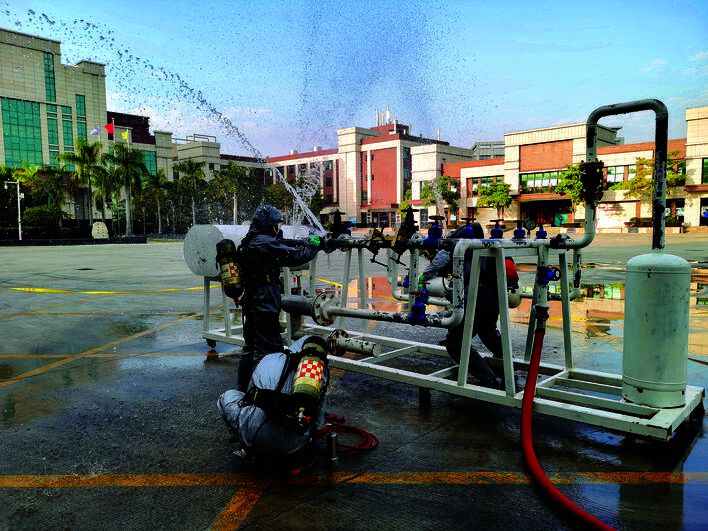 肩背空气呼吸器,负重赶往指定地点执行任务,应急救援队员的护目镜弥漫着汗水形成的薄雾,但他们顾不了眼前的阻碍,仍迅速使用仪器侦测泄漏点,采用快速堵漏工具及时堵住泄漏点,防止事态进一步恶化……这一幕是国家危险化学品应急救援惠州队(以下简称“惠州救援队”)进行泄漏抢险应急处置演练的场景。日前,记者走进国家危化品应急救援惠州基地,看到队员们正在执行演练任务,大家朝气蓬勃。