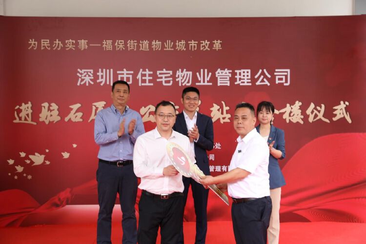 4月8日上午,在石厦南公交总站宿舍楼举办物业进驻仪式上,由福保街道党工委书记余杰、福田区住建局副局长杨启荒、街道党工委副书记张桦、福保派出所所长刘智、深圳巴士集团物业分公司总经理张龙文、区住建局物业监管科科长许广坚、益田社区居委会主任胡萍、深圳市住宅物业管理有限公司常务副总经理赵泰、深圳市万物云城城市运营总监王蔚东以及石厦南公交总站宿舍楼几位业主代表共同见证“物业城市”改革所取得的这个阶段性成果。