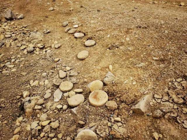 在岩镇一处浮出水面、老地名叫“珍贝村珍贝坝”的山头上,眼尖的黄志青发现湖边山头有许多浮出水面的古墓,便上前实地探看,在一座占地30余平方米的古墓旁边,黄志青“踩”在松软的沙土时,在距离古墓旁约5米处意外发现了有10余枚散落在地的圆饼形陶制品。