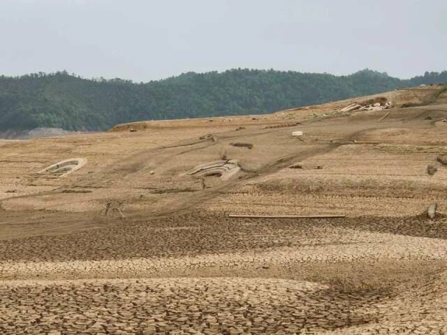 记者现场看到,随着枫树坝库区水位的下降,数十座客家围龙屋遗址在水中若隐若现,露出湖面的黄土高坡,成片泥地呈龟裂状态,偶尔可见泥地里躺着横七竖八被晒干的死鱼。
