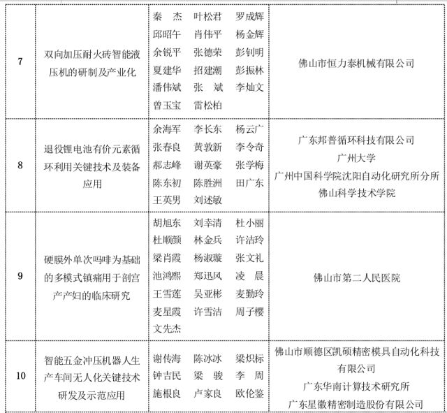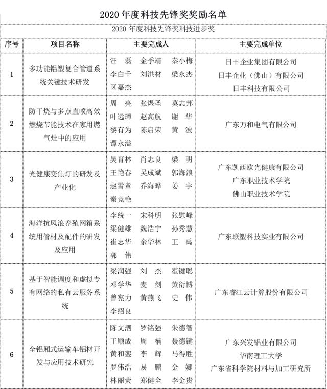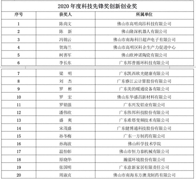 在2020年度佛山市科技先锋奖的活动中,经形式审查、专业评审组评审、拟奖公示等规范程序,并经科技先锋奖励委员会审核批准,佛山市共有10个科技项目获评科技进步奖,佛山市20名科技人才获评创新创业奖。获奖成果基本涵盖了家电、新材料、新一代电子信息、高端装备、生物医药等佛山重点产业。