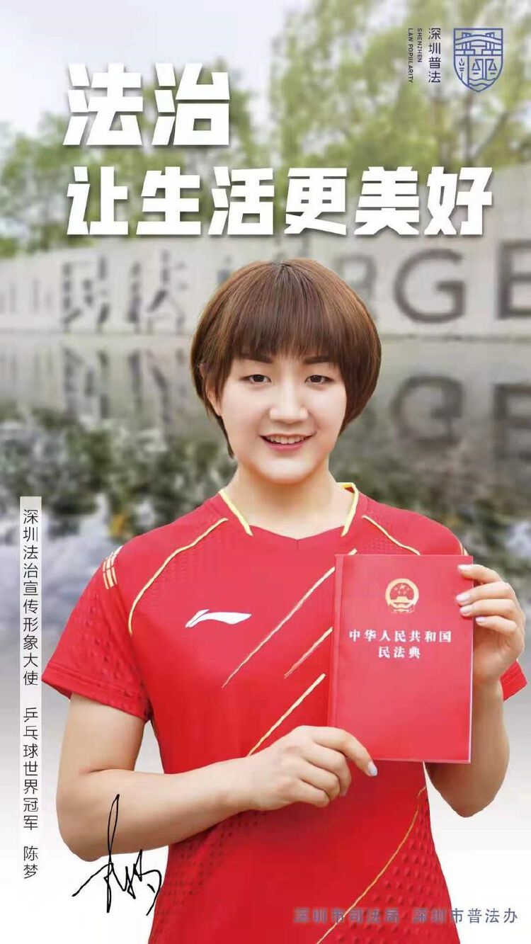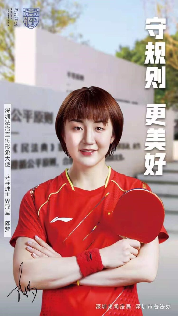 此前,深圳市司法局邀请乒乓球世界冠军,中国乒乓球运动员陈梦担任“深圳法治宣传形象大使”。3月17日,陈梦获颁“深圳法治宣传形象大使”聘书,正式成为了深圳法治的“形象代言人”。