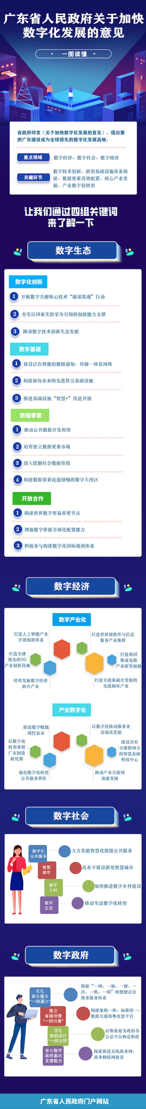 《意见》围绕数字生态、数字经济、数字社会、数字政府等数字化发展重点领域,对广东经济社会数字化发展进行全方位的系统布局,提出8点共33项具体措施,目标直指把广东建设成为全球领先的数字化发展高地。