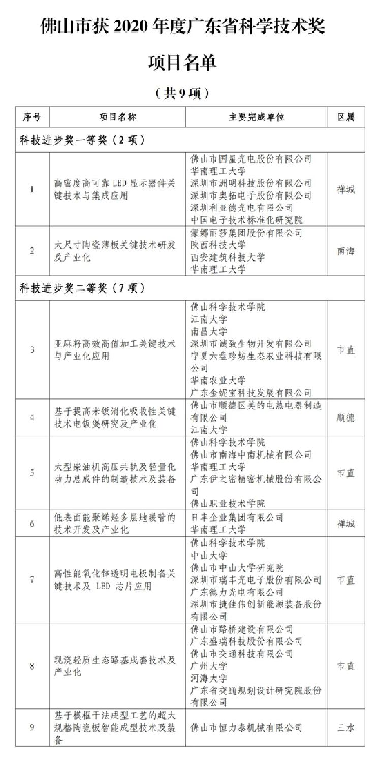 5月20日,广东省科技创新大会在广州召开。佛山设分会场,大会颁发了2020年度广东省科学技术奖,其中,佛山共获2项一等奖、7项二等奖,总数为9项,居全省第3位。近五年来,佛山企事业单位获广东省科学技术奖数量连续保持全省第三。 钟南山等作为主要完成人的新发冠状病毒感染的防控策略与临床诊治项目获科技进步奖特等奖;宋尔卫获得2020年度广东省科学技术突出贡献奖;离散系统的变分法及其应用等11项成果获自然科学奖一等奖;高强度全回收增产地膜先进制造与循环利用等6项成果获技术发明奖一等奖。 由佛山市国星光电股份有限公司担任第一完成单位的“高密度高可靠LED显示器件关键技术与集成应用”项目,获科技进步奖一等奖。除国星光电外,该项目的主要完成单位还包括华南理工大学、中国电子技术标准化研究院及多家深圳企业。 该项目组经数年理论创新与技术研究,在微型显示器件光色设计理论、高耐候精密封装架构、低缺陷高效制造以及微型显示模块集成与控制技术等方面取得突破,解决了LED显示器件高密度高可靠技术瓶颈,项目多项关键指标达到国际领先水平。 佛山另一获一等奖的项目为“大尺寸陶瓷薄板关键技术研发及产业化”,第一完成单位为佛山著名陶瓷企业蒙娜丽莎集团股份有限公司。项目针对传统陶瓷产业原料燃料消耗大、废气排放高、产品档次低三大关键问题,通过产学研联合攻关,大幅降低单位面积原料以及能源消耗,技术居国际领先水平,带动了国内陶瓷薄板井喷时代的来临,引领我国陶瓷行业走向绿色、智能、资源节约的高质量发展道路。 佛山获得二等奖的项目有:佛山企事业单位作为第一完成单位的项目还包括恒力泰机械有限公司的“基于模框干法成型工艺的超大规格陶瓷板智能成型技术及装备”、美的电热电器制造有限公司的“基于提高米饭消化吸收性关键技术电饭煲研究及产业化”、日丰企业集团有限公司的“低表面能聚烯烃多层地暖管的技术开发及产业化”、佛山市路桥建设有限公司的“现浇轻质生态路基成套技术及产业化”等项目。此外,在2020年度广东省科学技术奖获奖项目中,佛山科学技术学院获得3个二等奖,创历年最好成绩。 科技创新平台建设取得了飞速发展,这为获得科技奖创造了条件。近年来,佛山大力引进大院名校组建各类科技创新载体,佛山季华实验室、仙湖实验室、中国科学院佛山产业技术研究院、佛山(华南)新材料研究院、中国科学院苏州纳米技术与纳米仿生研究所广东(佛山)研究院、香港科技大学佛山智能制造研究院等平台载体相继落地。 其中,在省实验室建设方面,佛山季华实验室率先取得产权并进驻工作,争取到国家和省重大科技项目10项、立项经费超过5亿元。佛山仙湖实验室重点围绕氢能产业发展,在光伏制氢与光热制氢关键技术及示范等领域的研究已经取得重大进展。