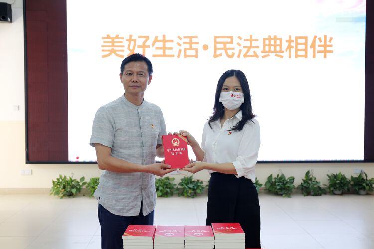 讲座伊始,工作人员将60本《中华人民共和国民法典》书籍赠送给南华小学的学生们,并联合小学党总支在每个五年级教室内设置法治书吧,培养学生的法律意识,让《民法典》真正在学生心里开花结果。
