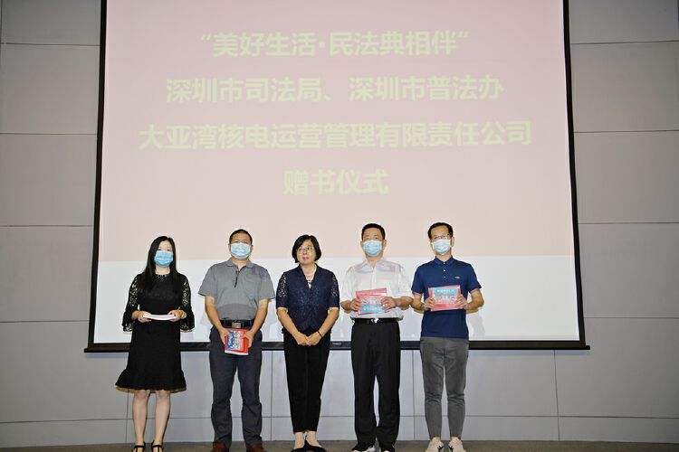 在随后的赠书仪式中,蒋小文代表深圳市司法局、市普法办向大亚湾核电运营管理有限责任公司、核服公司、工程公司、运营公司等中广核集团四家成员公司员工代表赠送《民法典》及相关普法书籍,帮助促进企业员工知法、守法、懂法、用法。