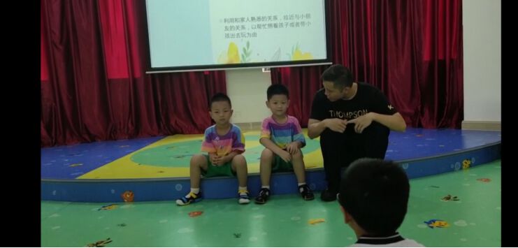 在实战环节,田警官为测试小朋友们应对陌生人的能力,现场扮演“变态怪蜀黍”,尝试用花言巧语哄骗小朋友。