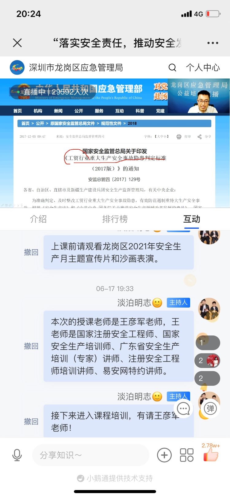 在此次在线培训中,龙岗区应急管理局邀请到注册安全工程师、国家安全生产培训师王彦军在线授课,以安全生产月为切入点,从法治建设的角度,解读《中华人民共和国刑法》中关于安全生产方面的重要条例。“企业里几乎所有的事故都是责任事故。”授课专家列举了近年来发生的重大安全生产事故案例,结合安全生产常见法律问题,聚焦易发生事故的重点环节向企业安全管理人员“传经送宝”。