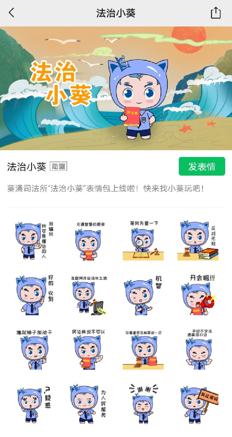 微信已成为人们当下最常用的聊天工具之一,表情包也经常在聊天当中被加以使用。制作“法治小葵”微信表情包,以群众喜闻乐见的形式将法治元素融入日常生活,这是葵涌司法所创新普法形式的又一举措。