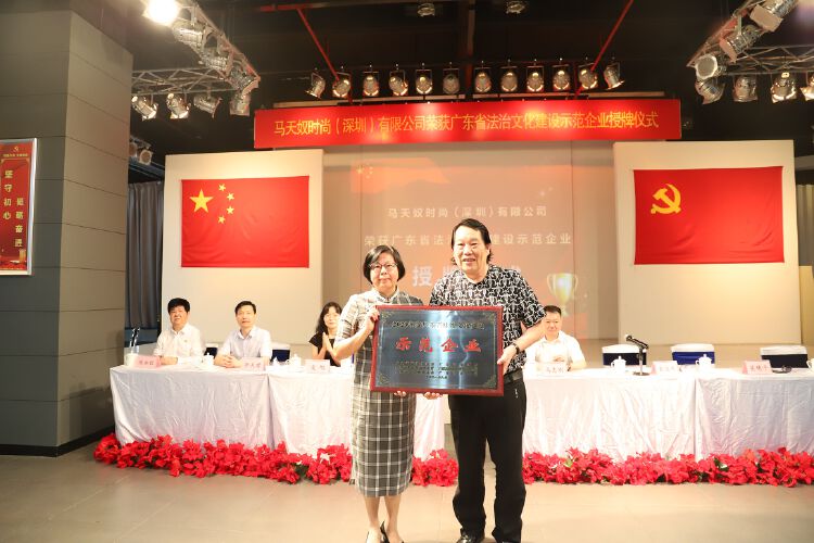 龙岗区企业马天奴时尚(深圳)有限公司荣获“广东省法治文化建设示范企业”称号。仪式上,深圳市司法局党委副书记、副局长蒋小文为马天奴公司授牌。