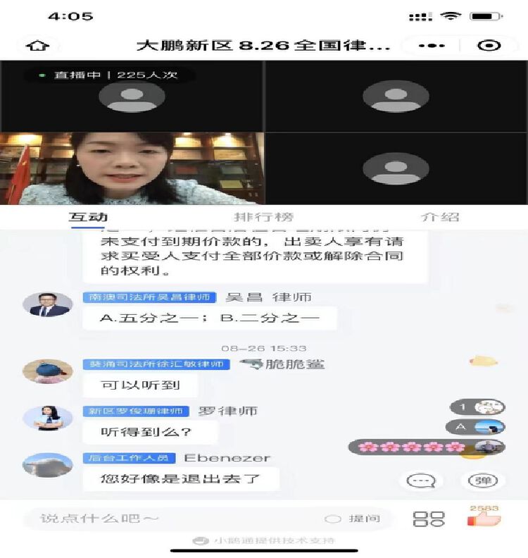 在长达三个小时的直播带法中,四位律师依次从不同角度给辖区居民解读了与人民生活息息相关的《民法典》,对合同、婚姻家庭、继承、侵权等篇章中的亮点条款进行解读,结合“忠诚协议是否有效”“儿媳妇是否可以继承公婆的房产”“高空抛物责任如何界定”等鲜活生动的小案例剖析具体条文,深入浅出地向大家阐述了《民法典》如何从生活的方方面面引导、规范着人们的行为,解释如何将法律思维运用到日常生活中,让大家真正走进这部“社会生活的百科全书”。