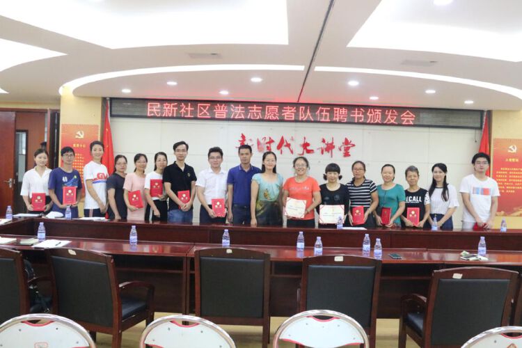 2019年2月28日,民治街道首支社区普法志愿者队伍在民新社区工作站成立。该队伍由社区法律顾问团队广东生龙律师事务所提出社区普法志愿队伍的方案。普法志愿者队伍除了开展常规的法治宣传、人民调解、法律咨询等业务之外,还通过普法志愿者向居民搜集他们最关心、最想了解的法律问题,由社区法律顾问律师团队研究商讨进行整理汇编,最终编印成册。目前,民治街道已经编印完成有关劳动争议、婚姻家庭与继承内容的两本普法口袋书。
