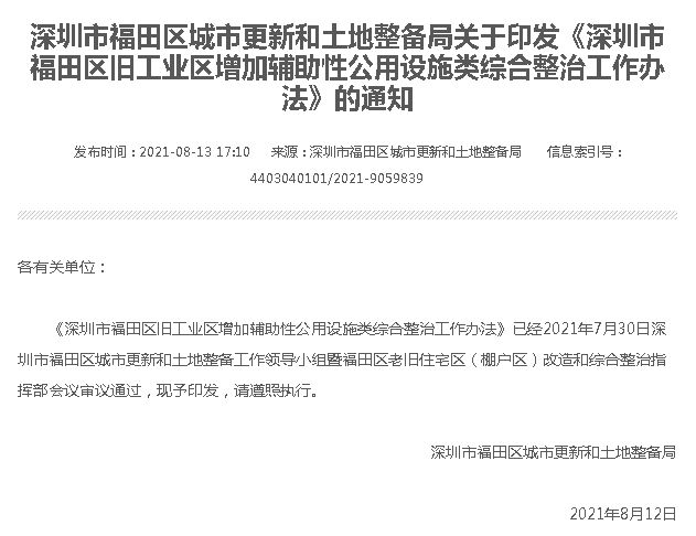 《深圳市福田区旧工业区增加辅助性公用设施类综合整治工作办法》全文包括四章共十条,分别为总则、申报条件、办理流程、附则,自2021年8月23日起施行。《工作办法》重点从三个方面就如何在现阶段加快推进福田区旧工业区增加辅助性公用设施类综合整治升级改造作出了规定。