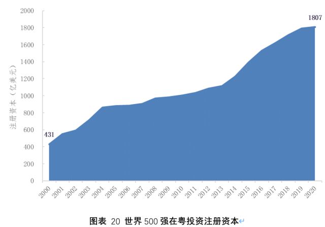 报告显示,2000年至2020年期间,境内和境外世界500强在粤投资注册资本规模分别增长了3.48倍和2.09倍,境内世界500强在粤投资发展增速超过境外世界500强。