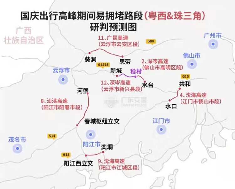 出程高峰期间易拥堵路段主要有:京港澳高速(广州市从化区段)、深岑高速(佛山市高明区段)、二广高速(肇庆市广宁县段)、沈海高速(江门市鹤山市段)、甬莞高速(惠州市惠东县段)、沈海高速(汕尾市海丰县段)、济广高速(河源市紫金县段)、汕湛高速(阳江市阳春市段)、沈海高速(阳江市江城区段)、京港澳高速(清远市佛冈县段)、广昆高速(云浮市云安区段)、深岑高速(云浮市新兴县段)。