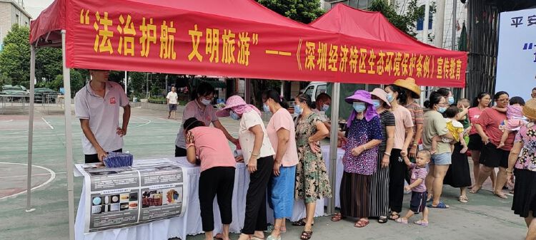 活动中,设立法律咨询区,由办事处驻点律师为居民详细讲解《深圳经济特区生态环境保护条例》法律内容,特别是针对“生态保护和修复”“外来物种入侵”“海域污染防治”等方面的内容,解答各类法律咨询,引导群众积极学习环保法律知识,提高法治意识,树立绿色环保理念,共同推进新时代生态文明建设。普法志愿者发放《深圳经济特区生态环境保护条例》《环境保护法》等法律法规宣传册和《绿色生态绿色民法》等生态环境保护相关宣传单,全面号召广大群众自觉维护身边生态环境,不断增强生态环境保护意识,抵制一切污染、破坏环境行为。