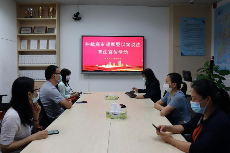 当天,恒丰银行等20家企业的人力资源负责人现场“零距离”观摩仲裁庭审,同时南部片区招商街道11个社区三十多名人民调解员通过在线直播方式观看巡回庭庭审现场。