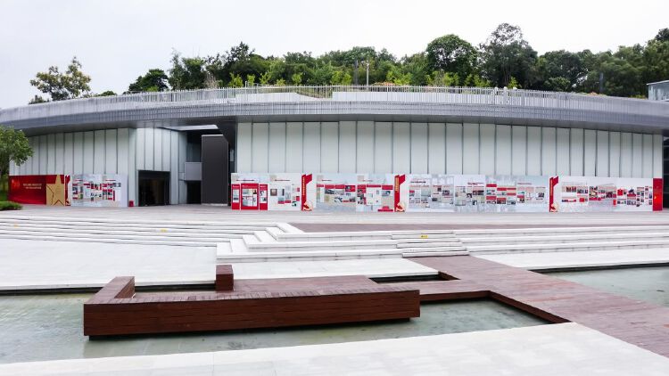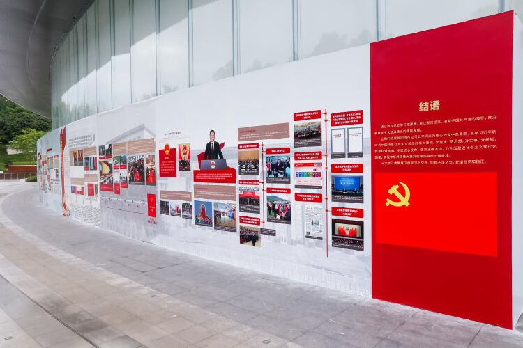 走进深圳民法公园,在民法博物馆的外围,就能看到醒目的展览现场。整体调性以红色和黄色为主,以白色为辅。据相关负责人介绍:“红色象征革命,体现中国共产党不忘初心、砥砺前行的百年光辉历程;黄色象征光明,体现百年来,党带领全国人民谱写了中华民族自强不息、顽强奋进的壮丽史诗;白色象征公正、清廉,体现中国共产党‘立党为公,执政为民’的执政理念。”