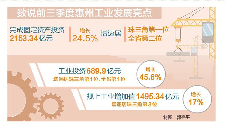 值得关注的是,前三季度,惠州完成固定资产投资2153.34亿元,增长24.5%,增幅居珠三角第一位、全省第二位;其中工业投资增长45.6%,高于固定资产投资增幅21.1个百分点。工业投资在全社会固定资产投资中占主要地位,对经济结构特别是工业产业结构有决定性影响,直接关系经济增长的质量和效益。工业投资增速超过固定资产投资增速,显示出聚焦制造业实体经济的强烈信号。