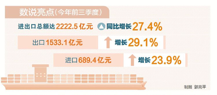 惠州海关统计数据显示,2021年前三季度,惠州市进出口总额达2222.5亿元,同比增长27.4%,其中出口1533.1亿元,增长29.1%;进口689.4亿元,增长23.9%。截至今年9月,惠州市单月进出口已连续15个月保持正增长。