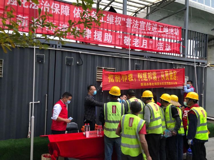 活动现场,新湖街道司法所工作人员在工友宿舍门口搭建普法宣传台,法律服务公益团为项目工友进行面对面普法宣传,“零距离”为工友提供法律服务,得到了广大工友的热烈响应。