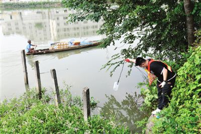 排查人员在河涌排污口处采样。余兆宇 摄