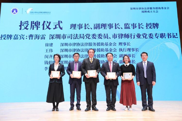 2021年12月30日,深圳市律协法律服务援助基金会(以下简称“基金会”)揭牌成立大会在深圳大剧院音乐厅举行,现场举行了揭牌、授牌等仪式。深圳市司法局党委委员、深圳市律师行业党委专职书记曹海雷,深圳市律师协会会长张斌,基金会理事长徐建及各区司法局代表出席大会,基金会创始出资单位代表及个人、基金会顾问团、企业及其他商协会代表、媒体和慈善界人士等共约150人参加大会。