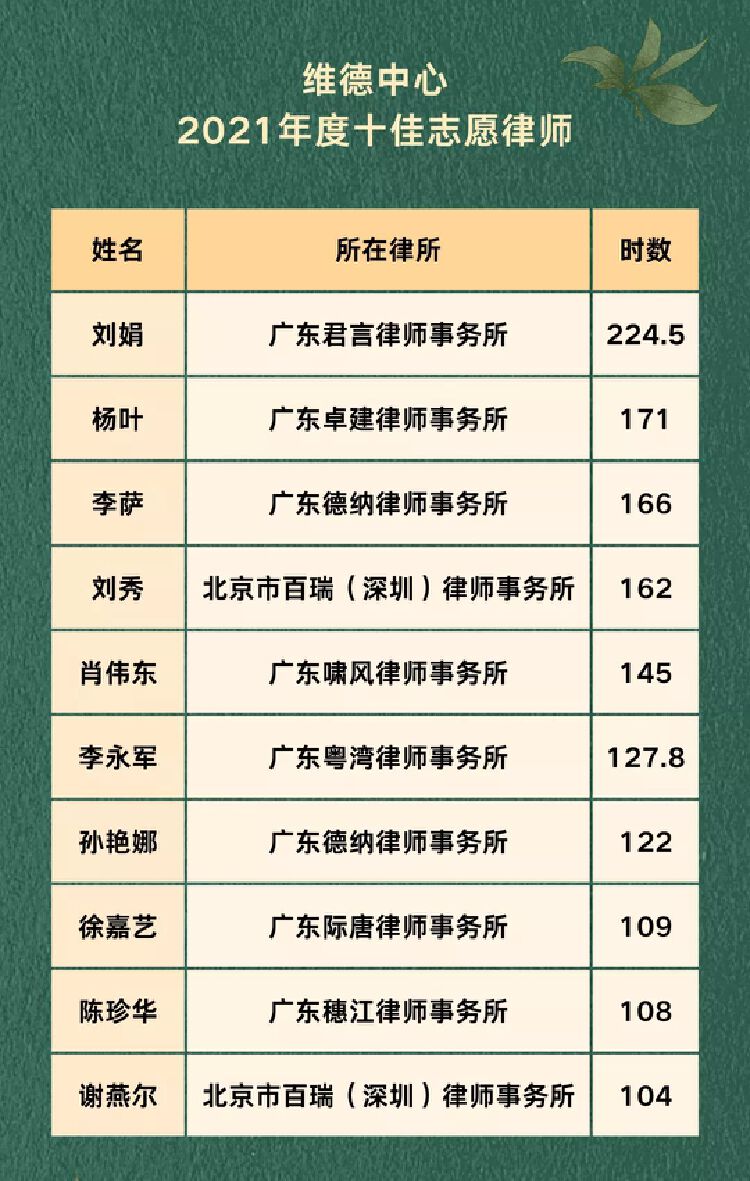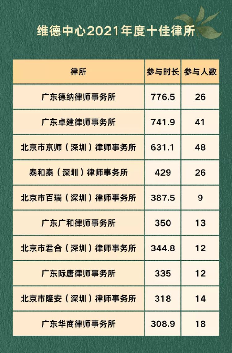统计数据显示,2021年参与度最高的十家律所共志愿服务3496.2小时,占总时数(7957.2小时)的40%。其中,广东德纳律师事务所参与时长居冠,为776.5小时;北京市京师(深圳)律所参与人数居冠,为48人。