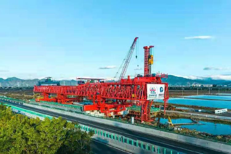 桩梁一体智能造桥机由深汕西改扩建项目自主研发,主要应用于项目梅陇特大桥建设。该桥全长共5400米,共需打设1368根预制管桩,架设684片预制盖梁、以及2736片预制双T梁。