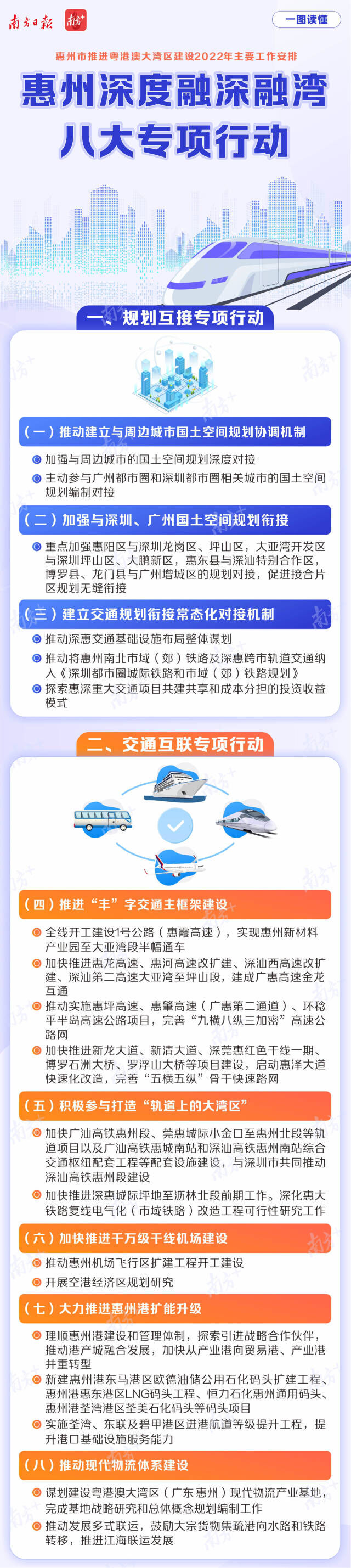 这是在粤港澳大湾区和深圳先行示范区“双区”建设和都市圈机遇下,惠州主动对接广深等大湾区中心城市的又一新动作。去年11月底,惠州市第十二次党代会报告明确提出“实施深度融深融湾行动”。此次《工作安排》是对融深融湾行动的细化落地和任务分解,并首次确定八大专项行动的具体内容,成为今年惠州融深融湾的“施工图”和“任务书”,将加快惠州与深圳一体化、同城化发展。