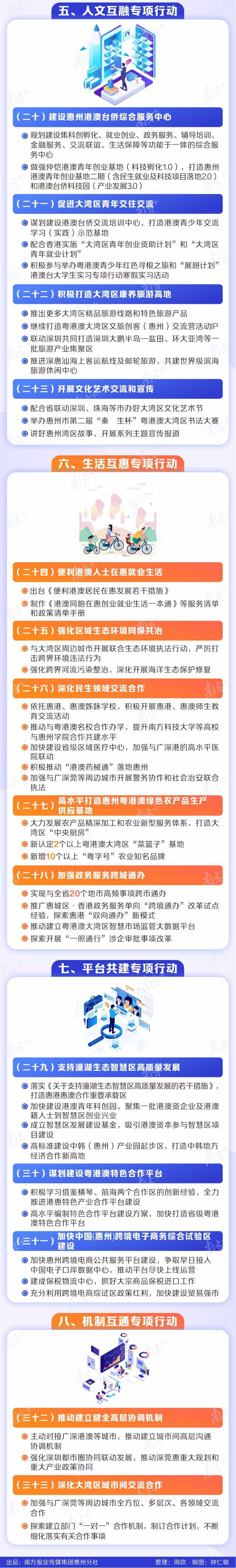 惠州市大湾区办负责人介绍,此次《工作安排》明确了深度融深融湾八大专项行动,涉及经济、社会、文化等方方面面,包括规划互接专项行动、交通互联专项行动、产业互补专项行动、科技互兴专项行动、人文互融专项行动、生活互惠专项行动、平台共建专项行动、机制互通专项行动。